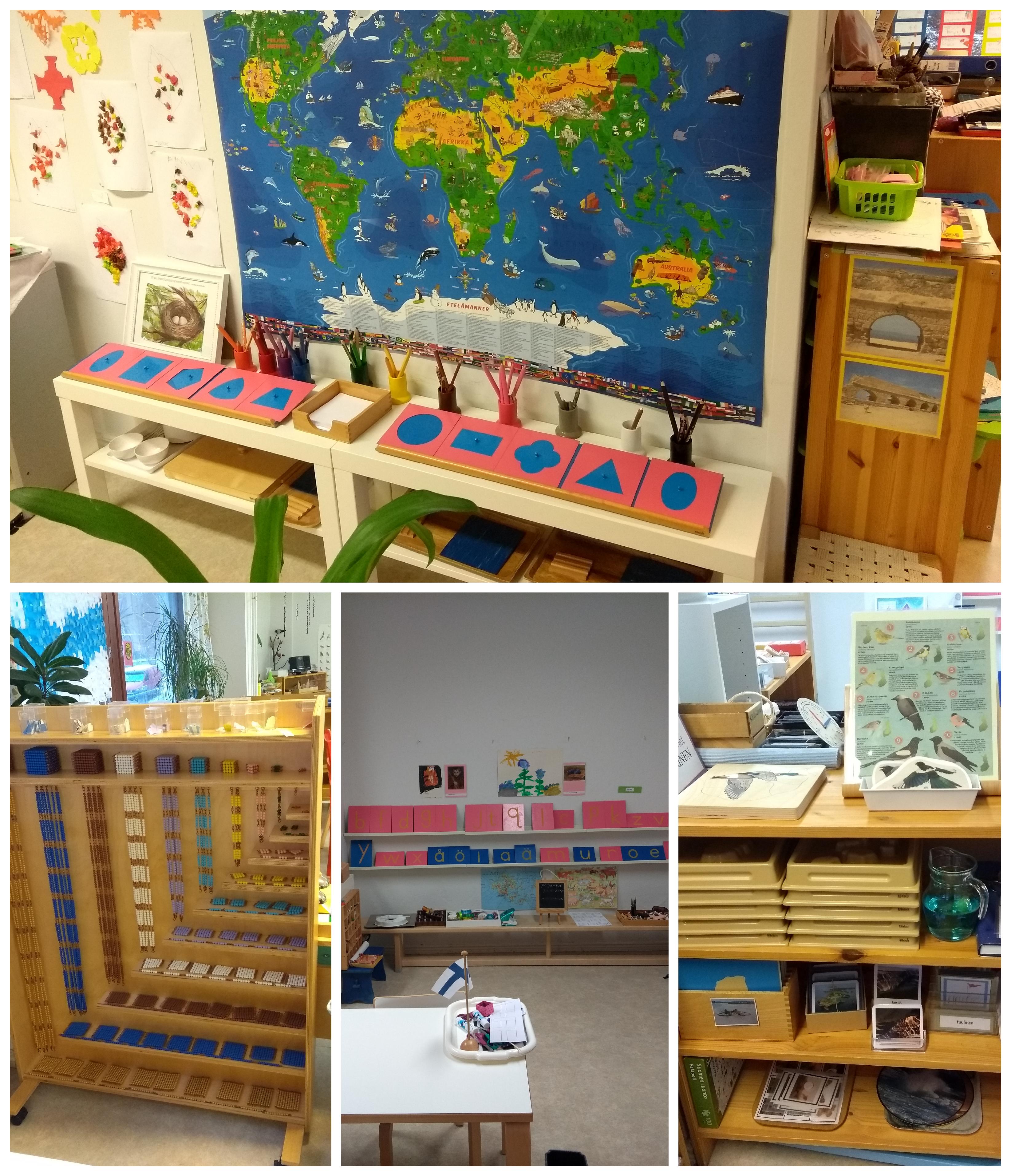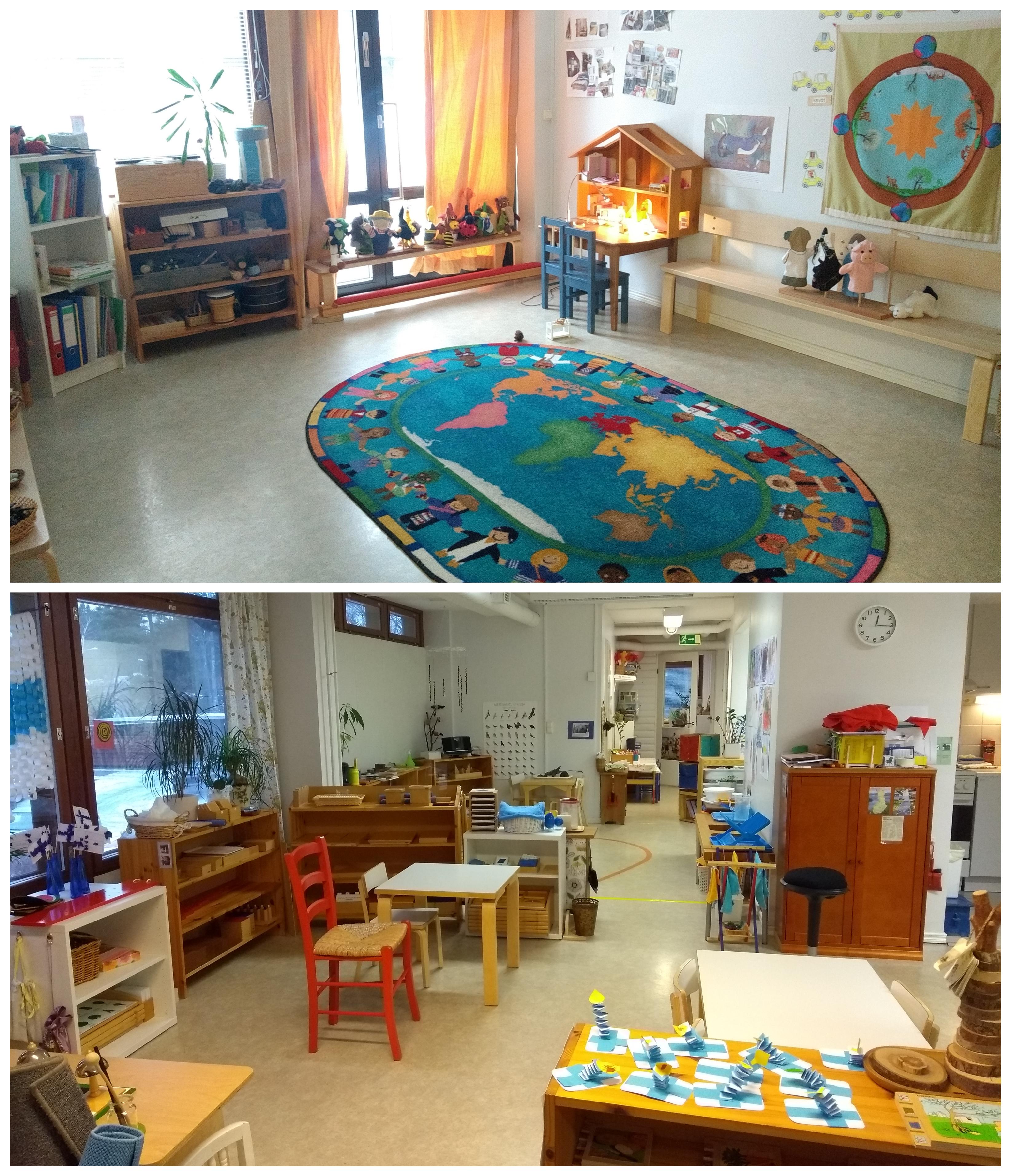 Mõlemad Soomes külastatud kohad olid eralasteaiad, kummaski majas tegutses ainult üks rühm. Tegemist oli segarühmadega (lapsed vanuses 2,5–6 a), nagu Montessori süsteemis ette nähtud ongi. Esimeses lasteaias viibisin kella üheksast üheni. Nägin ära nende tavapärase töötsükli, lõunapausi ja õueskäigu. Minu hinnangul järgiti Montessori põhimõtteid 100% ning keskkond oli ideaalselt ettevalmistatud. Koha asutaja on naisterahvas, kes on juba 25 aastat töötanud Soome haridussüsteemis eelkooliealiste lastega ning viimased kümme aastat sellest ajast on ta pühendanud Montessori-maailma rakendamisele ja eestvedamisele, mh Soome Montessori liidu juhatuse koosseisus. Ka tema oma lapsed on käinud Montessori lasteaias. Väga inspireeriv!