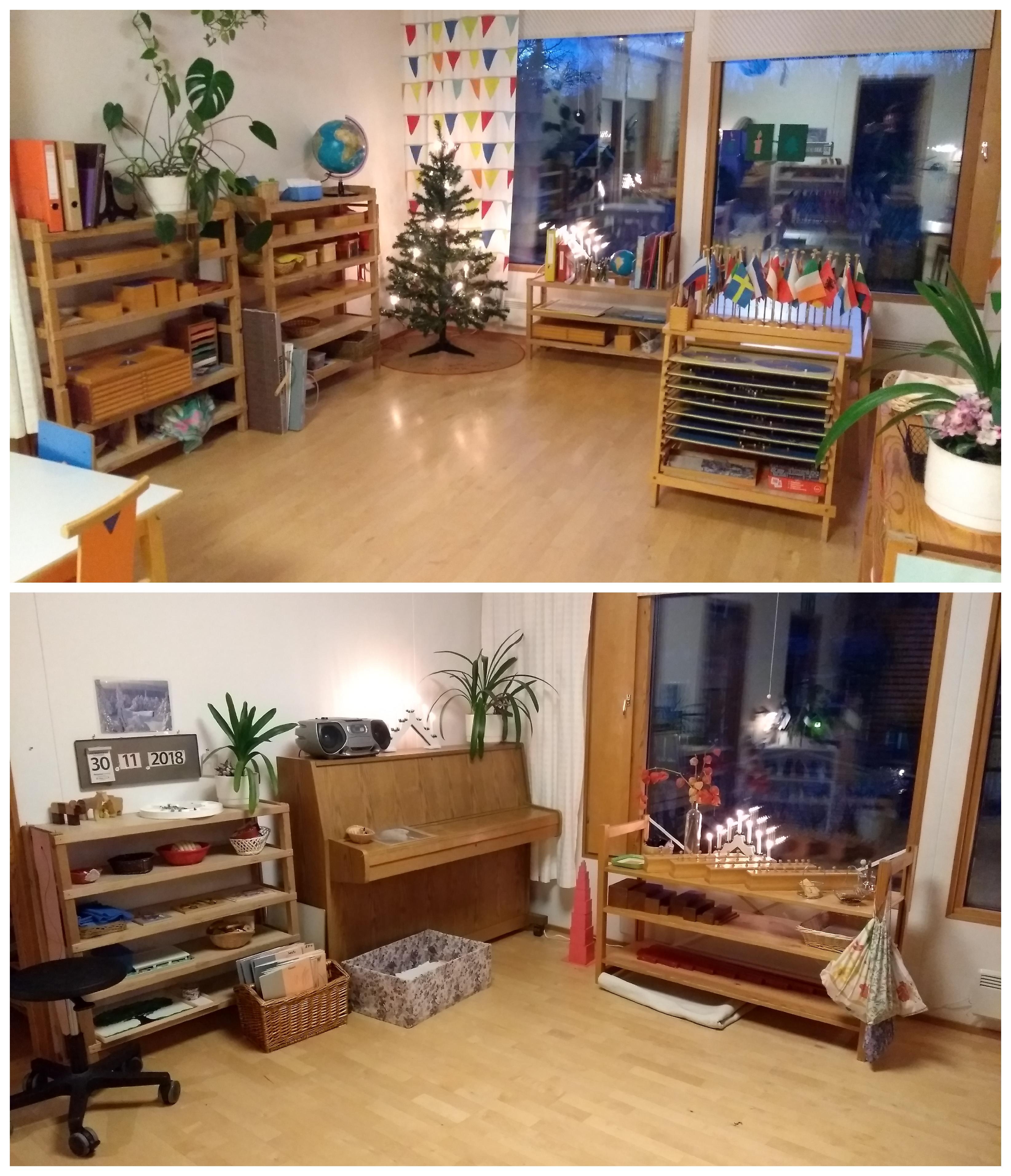 Kui parajasti piparkooke ei vormitud, toimetas igaüks omaette. Täpselt nii, nagu ehtsas Montessori keskkonnas tegutsemist ette kujutasingi. Vahendeid viidi lauale ja toodi sealt kandikutega. Vabalt olid saadaval vesi ja veekannud ning mitte ainult joogivee tarbeks. Tegevused toimusid laua taga või väikesel vaibakesel keset põrandat. Iga tegevuse juures (sama vaiba peal või laua taga) võis olla vaid kaks-kolm last korraga. Erandiks olid muusikalised tegevused, kus vahepeal laulsid ja mängisid pilli ühe vaiba ümber neli last ja juhendaja korraga. Lapsed rullisid ise vaibad lahti ja kokku. Väiksematele ja uuematele lastele pidi juhendaja vaid leebelt meelde tuletama, et vaip ikka tagasi pandud ka saaks. Suuremad lapsed (vanuses 5–6 a) ei vajanud mitte mingisugust juhendamist. Üks kolmeliikmeline koolieelikutest koosnev sõpruskond valis omale ise tegevuse, pani ise vahendid tagasi ja siis suundus järgmise tegevuse juurde. Paari tunni jooksul tegelesid need lapsed riigilippudega (neid asetati kaardile, aga nendega mängiti ka rallit ja sõda), loendasid helmeste abil numbreid, mängisid sõnamängu, tegid piparkooke ning abistasid (juhendaja palvel) üht umbes nelja-aastast last klotsidest püramiidi ehitamisel. Juhendi järgi pandi paika püramiidi alumine kiht, edasi jätkas väiksem laps üksi. Püramiidi ehitav laps istus selle tegevuse juures pikalt ja keskendunult ning oli üsna pahane, kui üks väiksem tormakam laps selle ootamatult ümber lükkas. Seesama nelja-aastane tegeles vahepeal pikalt ka lõnga lõikamisega. Juhendaja abiga sai mõõdetud õige pikkus ja lõpuks valmis sellest nöör paberist kiikrile, mida kaela ümber kaasas kanda ja millega mängult kaugusesse vaadata.