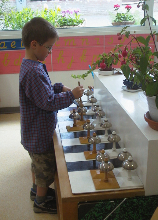 Meeltevahendid muutuvad lihtsast keerulisemaks. Vahendite esitlemist lapsele alustatakse lihtsamatest vahenditest ja lapse kasvades ning arenedes jätkatakse järjest keerulisematega. Näiteks esitleme lapsele kõigepealt binoomkuupi ja kui ta on sellega erinevatel viisidel töötanud, võime trinoomkuubiga edasi minna. Alloleval fotol on nupusilindrid alusel, hilisem vahend on aga värvilised silindrid. Värviliste silindrite järjestamise raskusaste on suurem, abiks pole enam vigade kontrollina toimivat alust. Et laps võiks antud tööd teha, peab ta nägemismeel juba sellevõrra rohkem teravnenud olema.