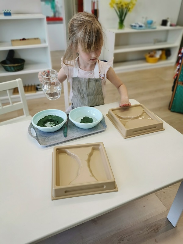 Montessori rühmas on lisaks ettevalmistatud täiskasvanule sama tähtis ka ettevalmistatud keskkond, mis võimaldab lapsel iseseisvalt toimetada. Õppevahendid on avatud riiulitel jagatud teemakeskustesse: igapäevaelu harjutused, meeltevahendid, emakeel, matemaatika ja kultuur. Lapsel on vabadus valida, millega ta parajasti töötada soovib. Lapse mängulist tegevust nimetatakse tööks, et rõhutada selle tähtsust – loob ju laps seeläbi iseennast, arendab oma aju ning omandab uusi oskusi.